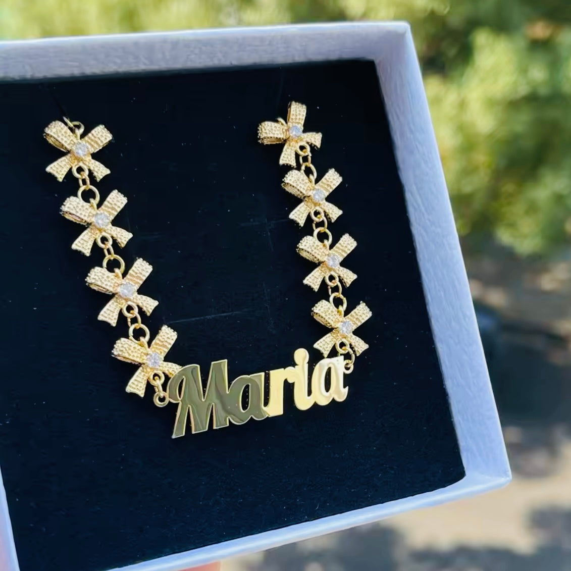 Personalize your style with this elegant 14K gold vermeil name necklace, featuring a cubic zirconia bow charm and heart pendant. Pair it with the matching CZ bow chain custom name bracelet for a complete set. This stunning set comes with your name in Elegant cursive lettering that sparkles and shines in every environment, be prepared to receive hundreds of compliments as soon as you walk into the room and watch all eyes light up - this set is unique and rare and not easily found, show off your style & make a statement!
