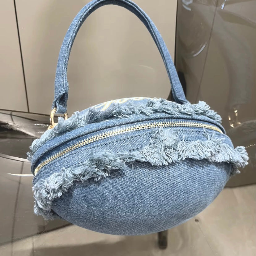 Score a fashion touchdown with this chic denim light blue football handbag! Designed for sports enthusiasts and style lovers, this unique accessory features durable denim material, intricate football-inspired stitching, and a playful fluffy fringe trim. The bold "Football" embroidery in golden thread adds a touch of elegance, while the spacious interior ensures practicality for everyday use. Perfect for game days, casual outings, or making a statement, this handbag is a must-have for anyone looking to combine sporty vibes with fashionable flair.