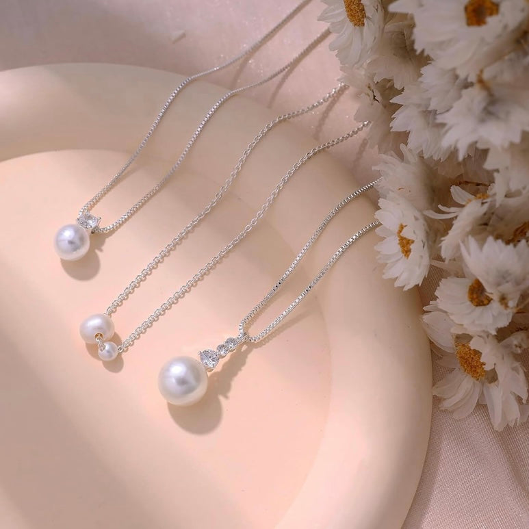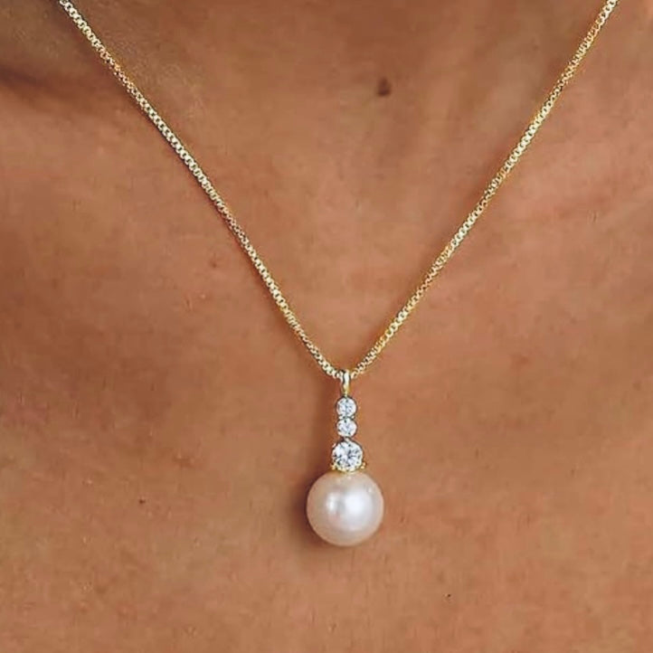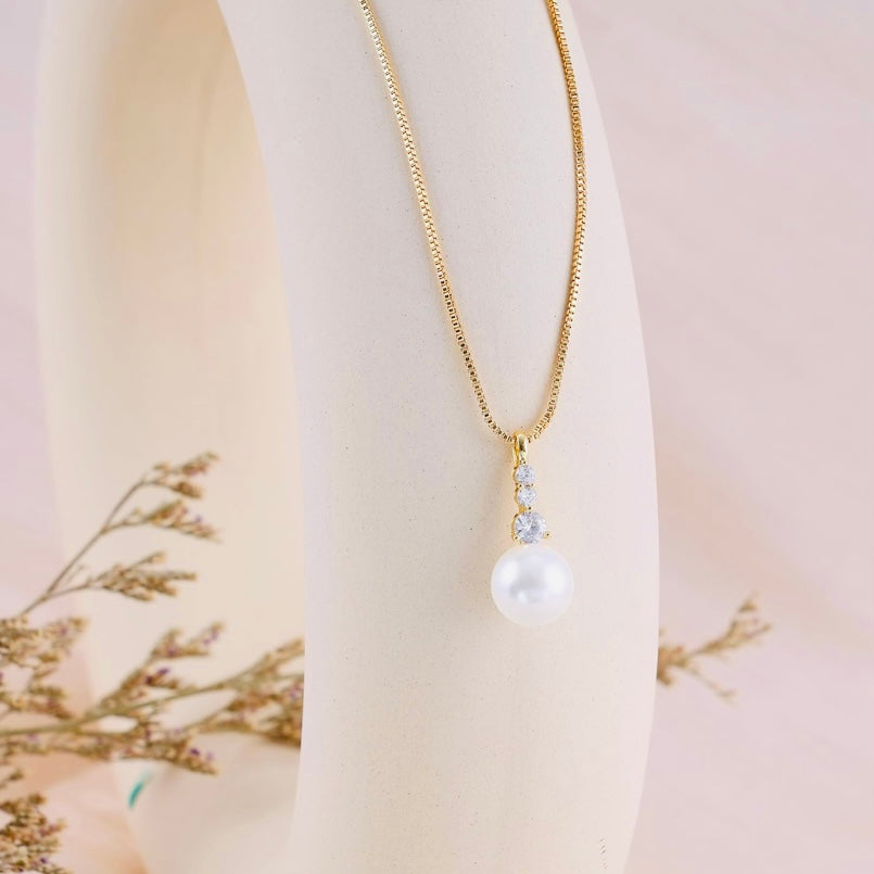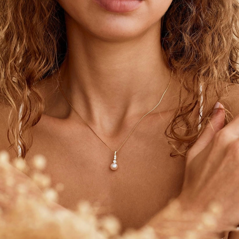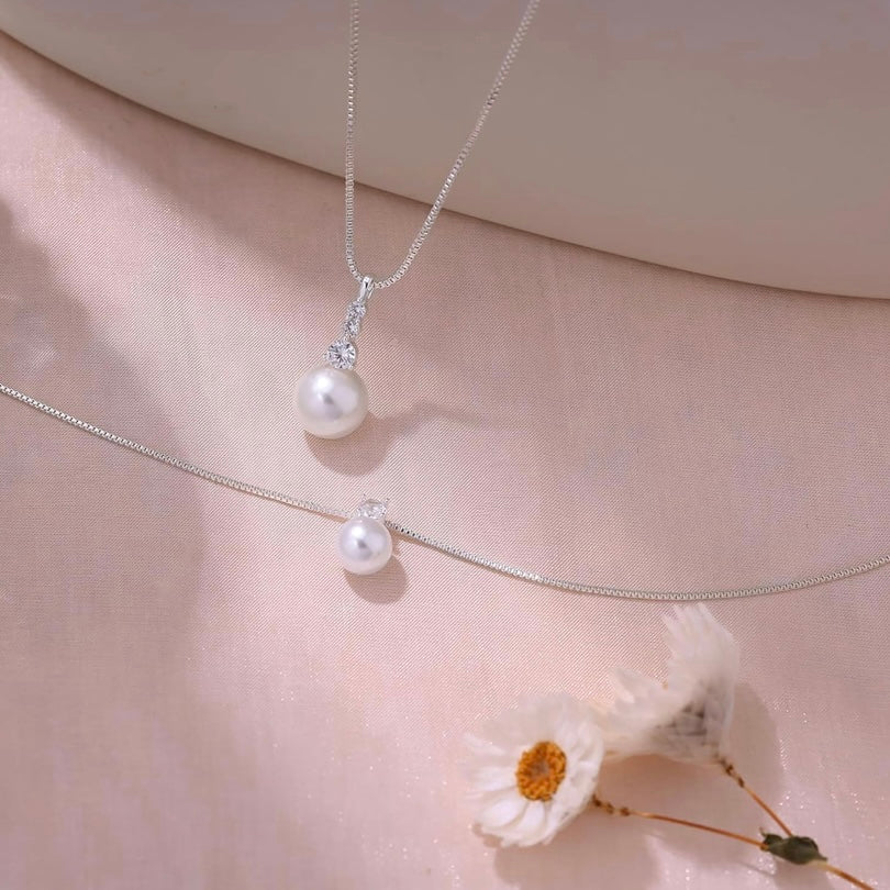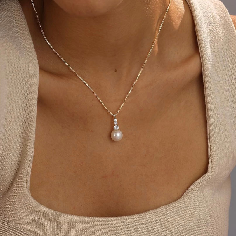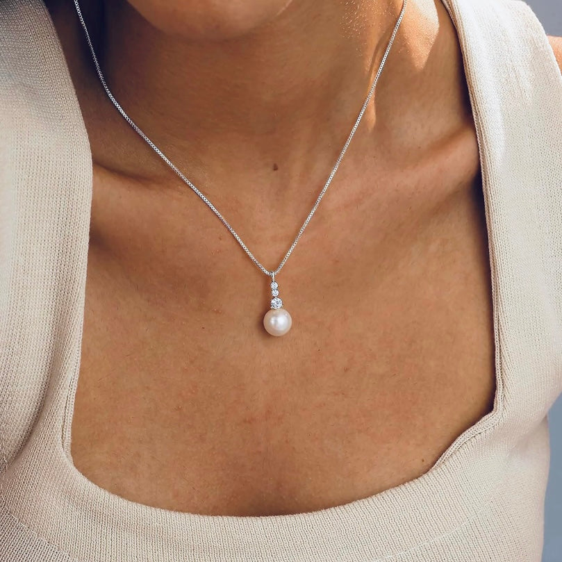 A stunning Freshwater Pearl Pendant featuring double stacked CZ gemstones on a 17-inch Silver Box Chain. The teardrop-shaped pendant showcases a white Pearl with excellent cut grade and heavily included gemstone clarity grade. This necklace is perfect for various occasions like Mother's Day, Engagement, Christmas, and more. It has a Bohemian theme and a pavé setting style, adding a touch of luxury to any outfit.