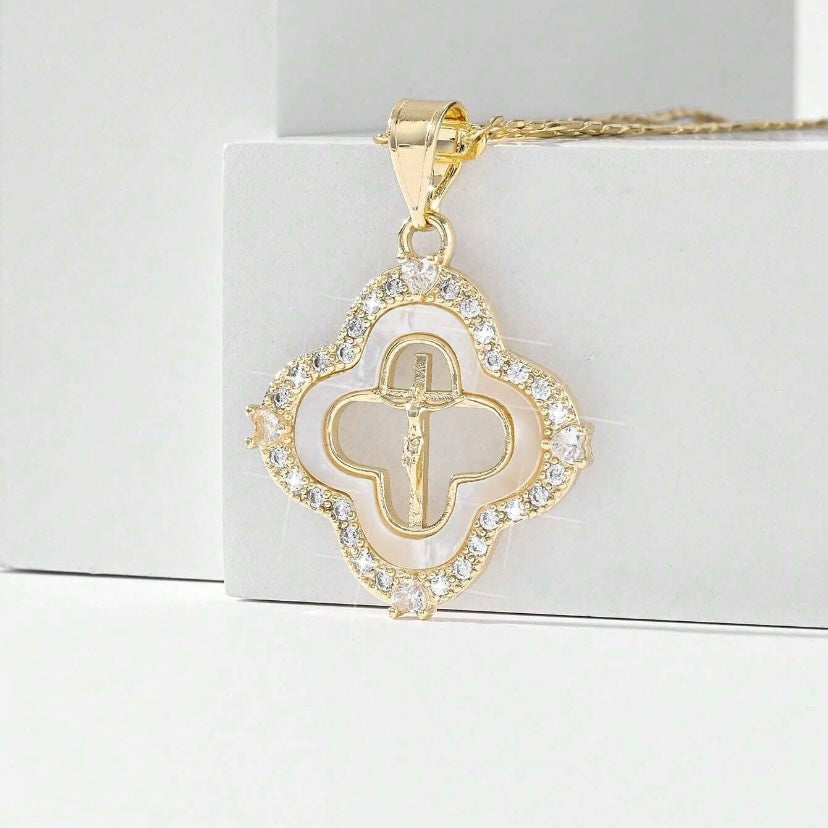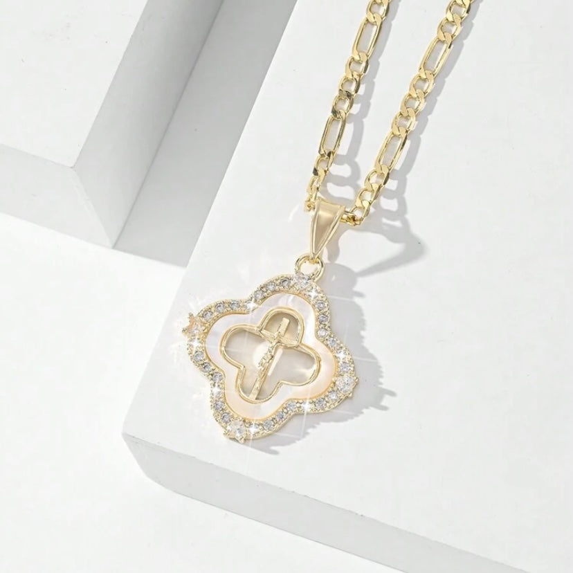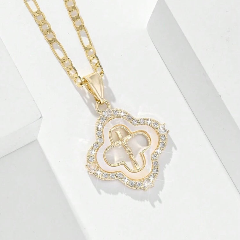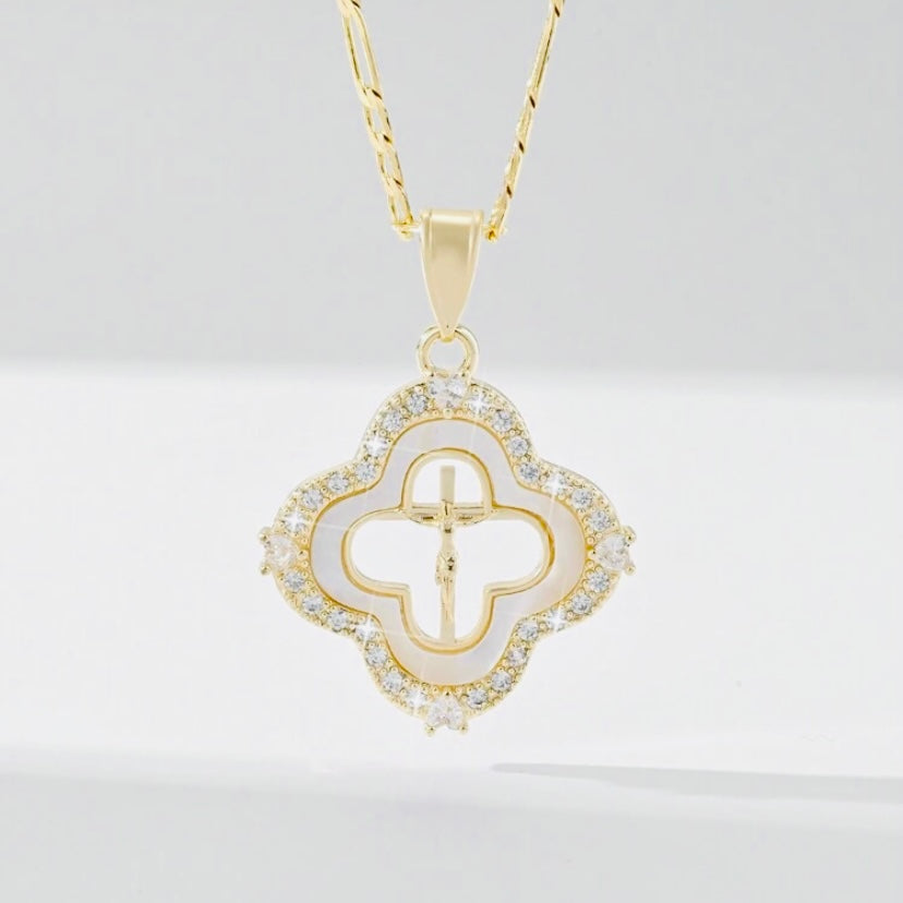 Showcase timeless elegance with this beautifully crafted gold crucifix pendant, nestled within a gleaming quatrefoil mother of pearl frame accented with shimmering Australian Crystals. Perfect for layering or wearing solo, this symbolic piece blends spiritual grace with classic luxury—ideal for everyday wear or special occasions.