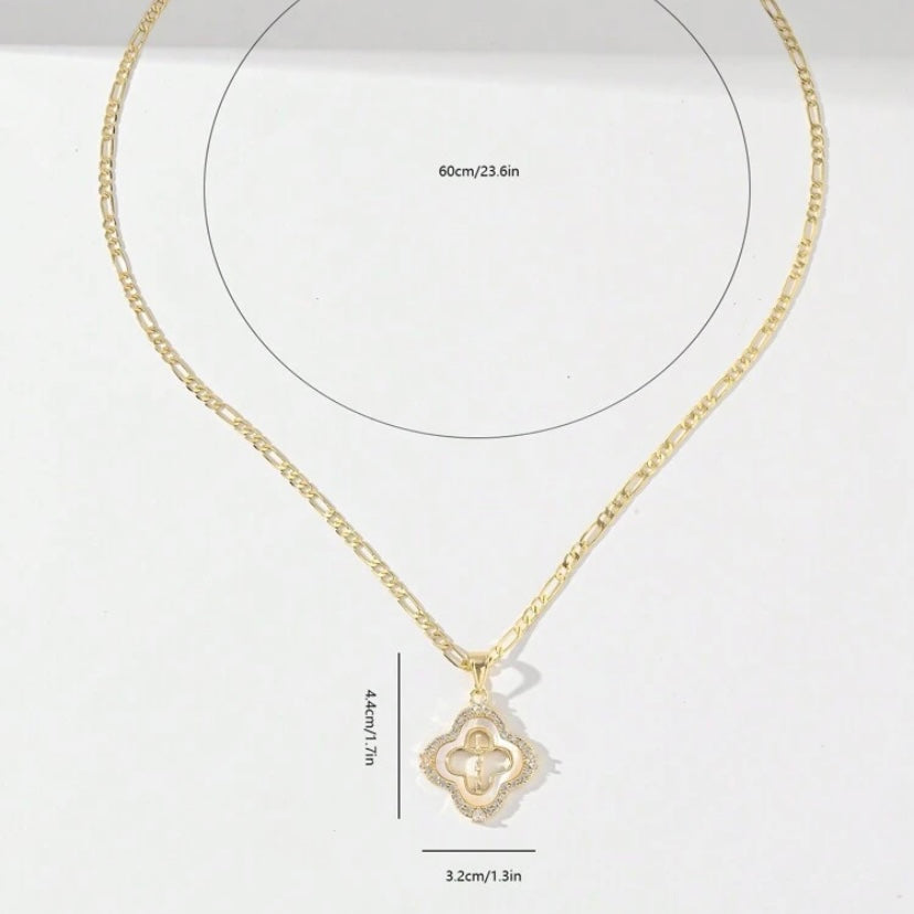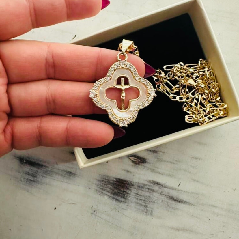 The 14k Vermeil Gold Cross pendant is surrounded by an iridescent “Mother of Pearl” Clover-like Sea shell, embellished with small sparkling Australian crystal stones around the edge and at it’s central design—The measurements are (60 cm chain, 4.4 cm tall pendant) this necklace is designed to sit fairly low, making it a beautiful noticeable statement piece, perfect for layering or wearing solo.