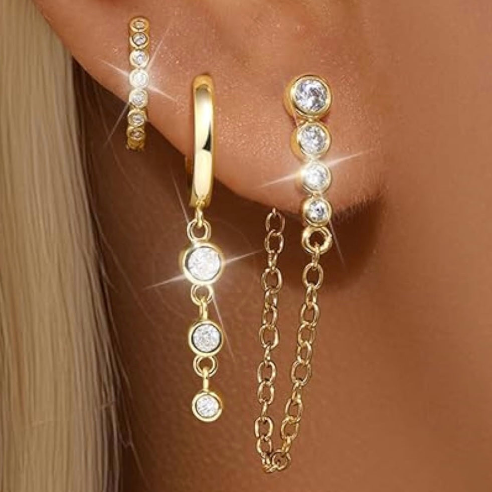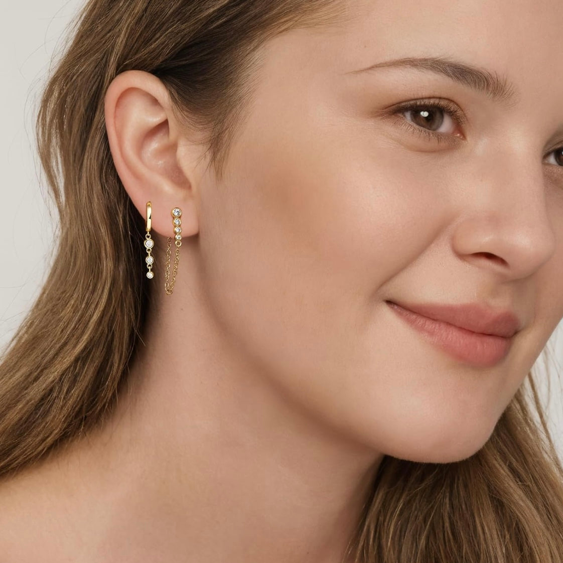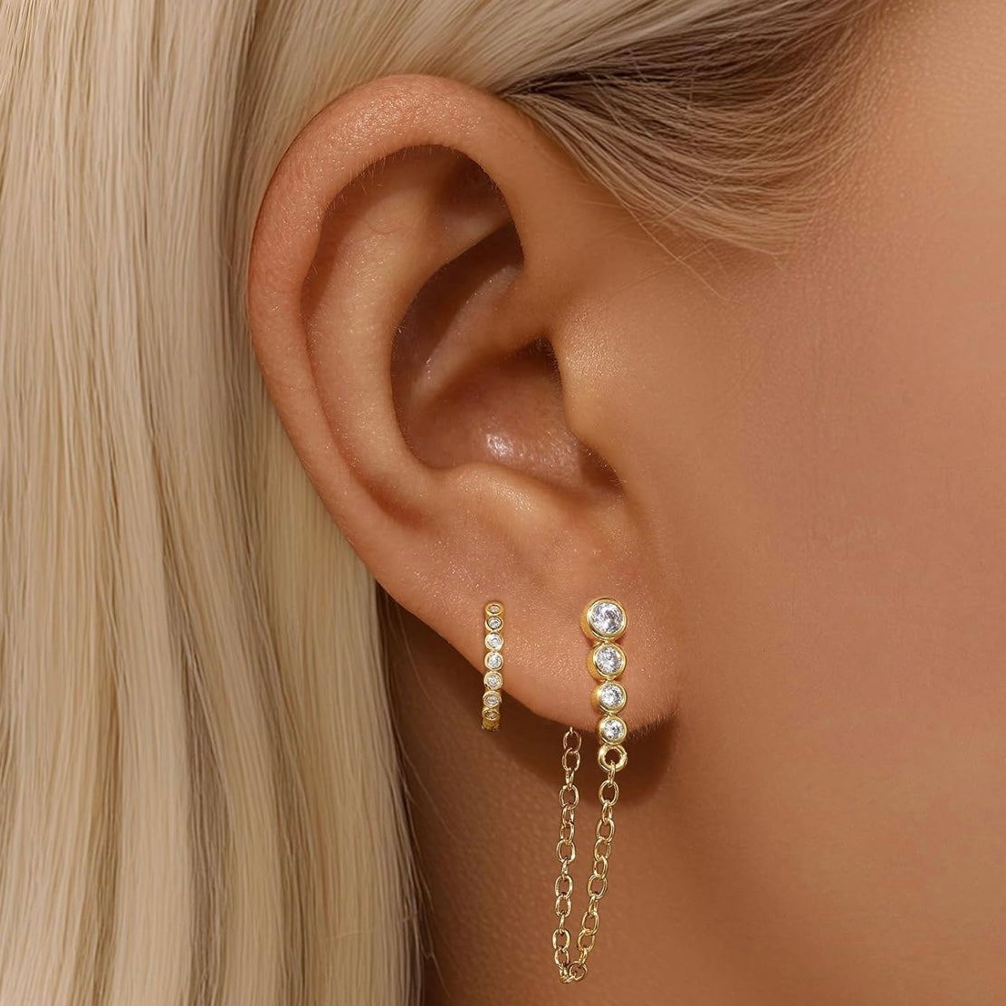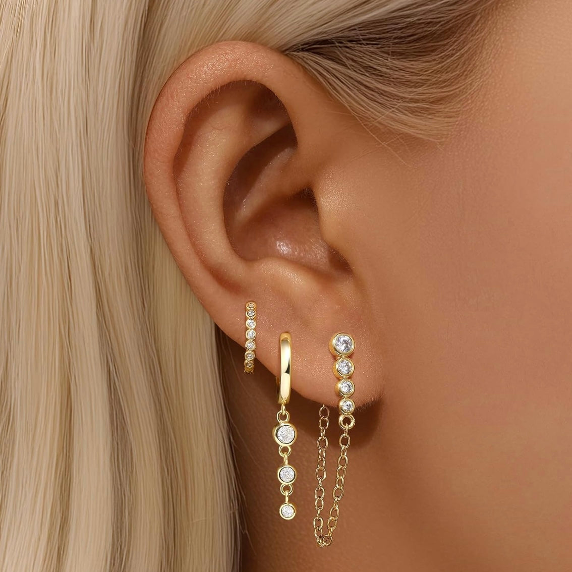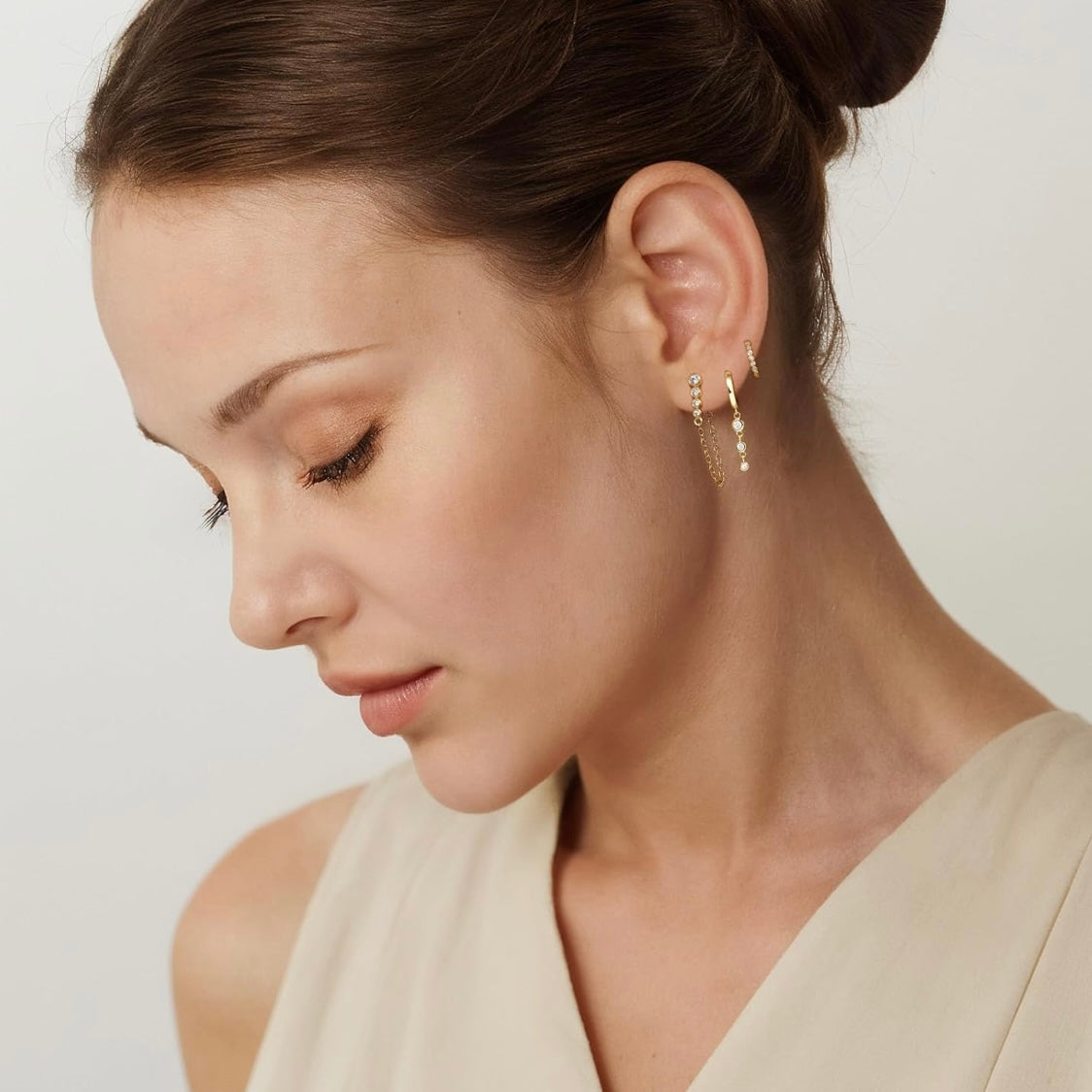 Elevate your ear game with our Gold Ear Stack Set, a curated Ear party collection of elegant dainty hoops, sparkling CZ studs, and dangling chain-linked earrings designed for creative self-expression. Each piece features flawless AAA clear round diamond-cut cubic zirconia gemstones—think diamond-like sparkle—set in high-quality 14k gold plating over solid Silver for a hypoallergenic, super shiny, water resistant luxe finish.