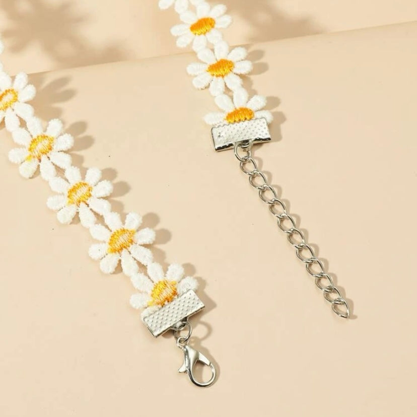 Handcrafted Adjustable White and Yellow Springtime Floral Themed Flower Choker Necklace w/5 Inch Silver Extender