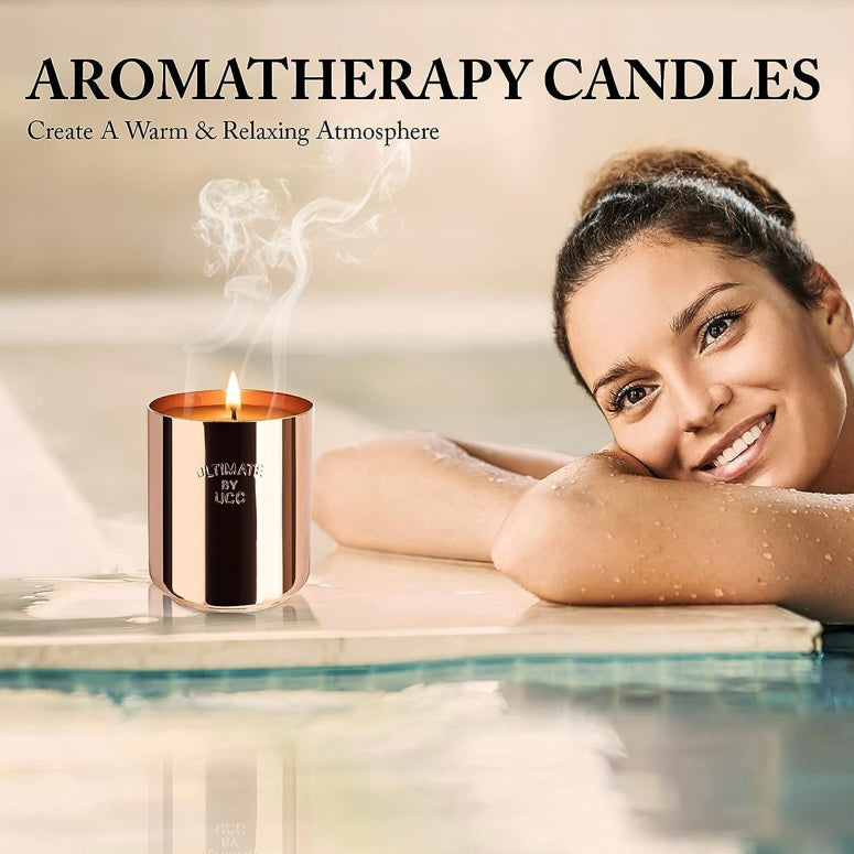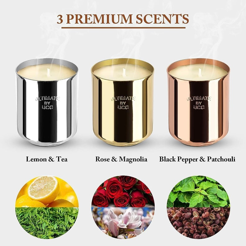 Transform your space with Ultimate luxury soy candle Set by “The Beauty Gods”. These beautiful luxury scented candles come in three premium scents: Lemon & Tea, Rose & Magnolia, and Black Pepper & Patchouli. Each candle is crafted with 100% soy coconut wax for a clean burn and infused with premium essential oils to deliver a refreshing aroma. Each Candle is Housed in elegant metallic containers of gold, rose gold, and silver which blends perfectly & adds a touch of sophistication to any decor. Enjoy the high scent throw and lead-free wick for a safer and more enjoyable experience.