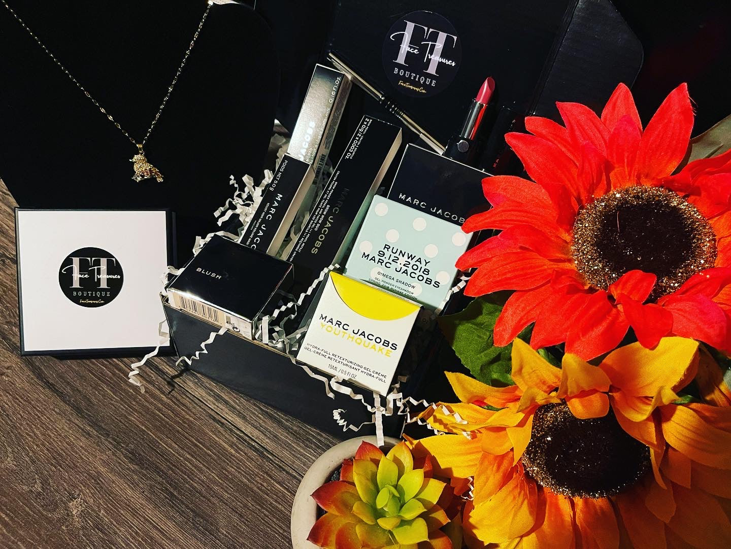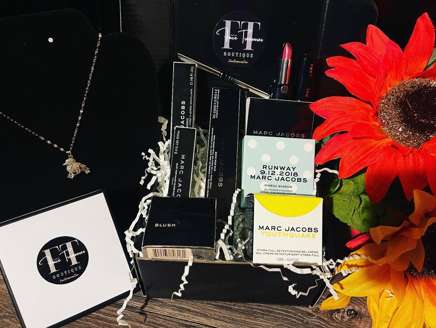 This rare Marc Jacobs limited and rare makeup, Skincare, and jewelry holiday bundle come in a beautiful luxury box overflowing with some of the world's most popular and professional makeup & Skincare including one beautiful Swarovski Semi-Precious Crystal Gold 18k plated bird necklace. With a box value well over $225, it's no wonder why these boxes are selling fast!