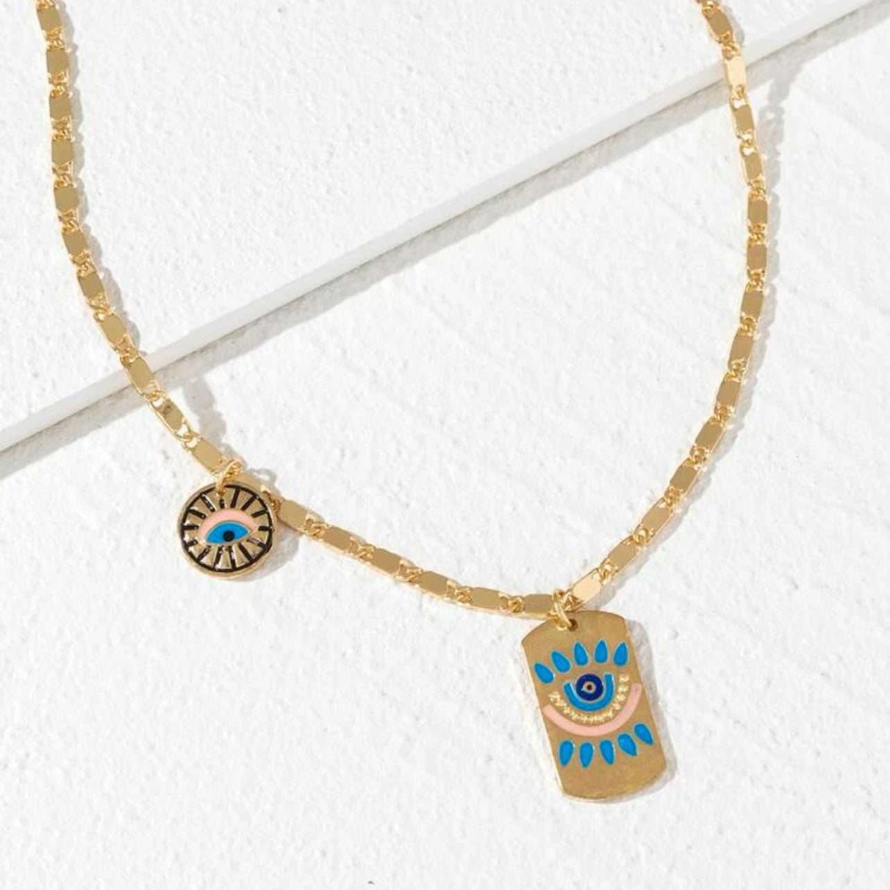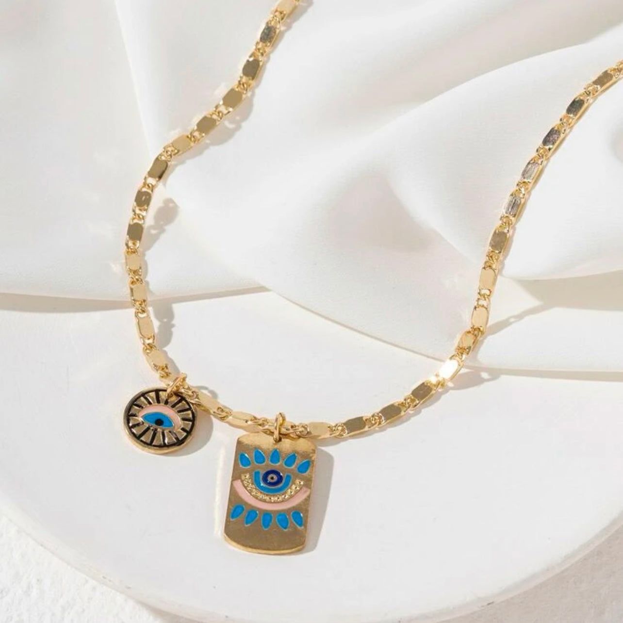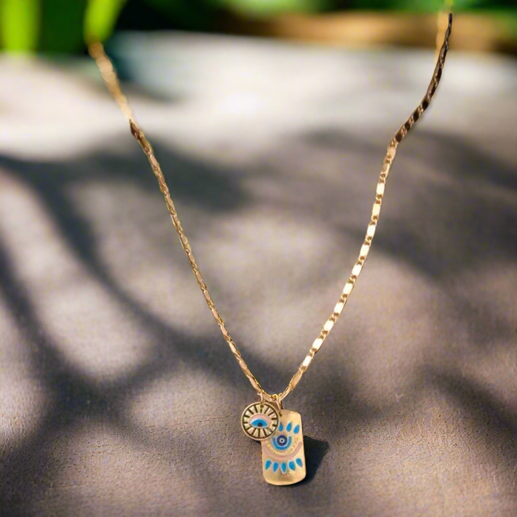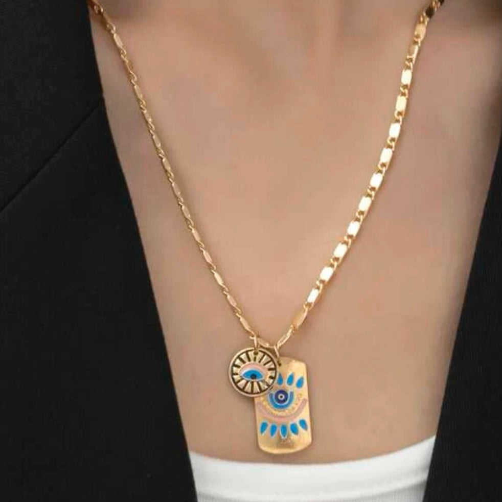 Experience elegance and protection with our Gold Plated Evil Eye & Protection Pendant Necklace. The stunning blue enamel accents on the 10k gold plated "Dog Tag" style pendant and the round Evil eye pendant add a touch of sophistication. With a durable 17In chain, this necklace is the perfect blend of style and protection. Crafted with intricate details, it is sure to bring you good fortune and good luck daily & a ton of compliments!