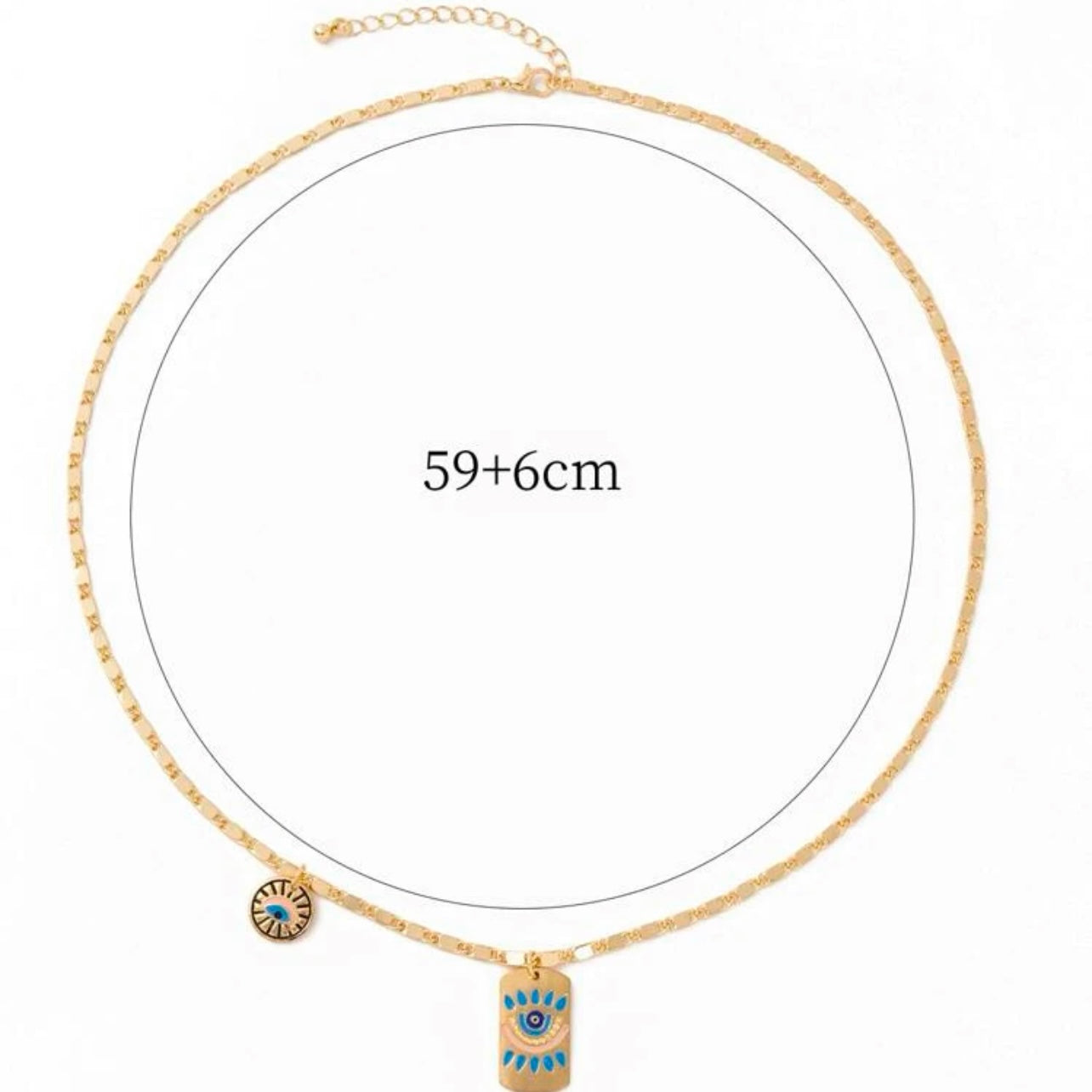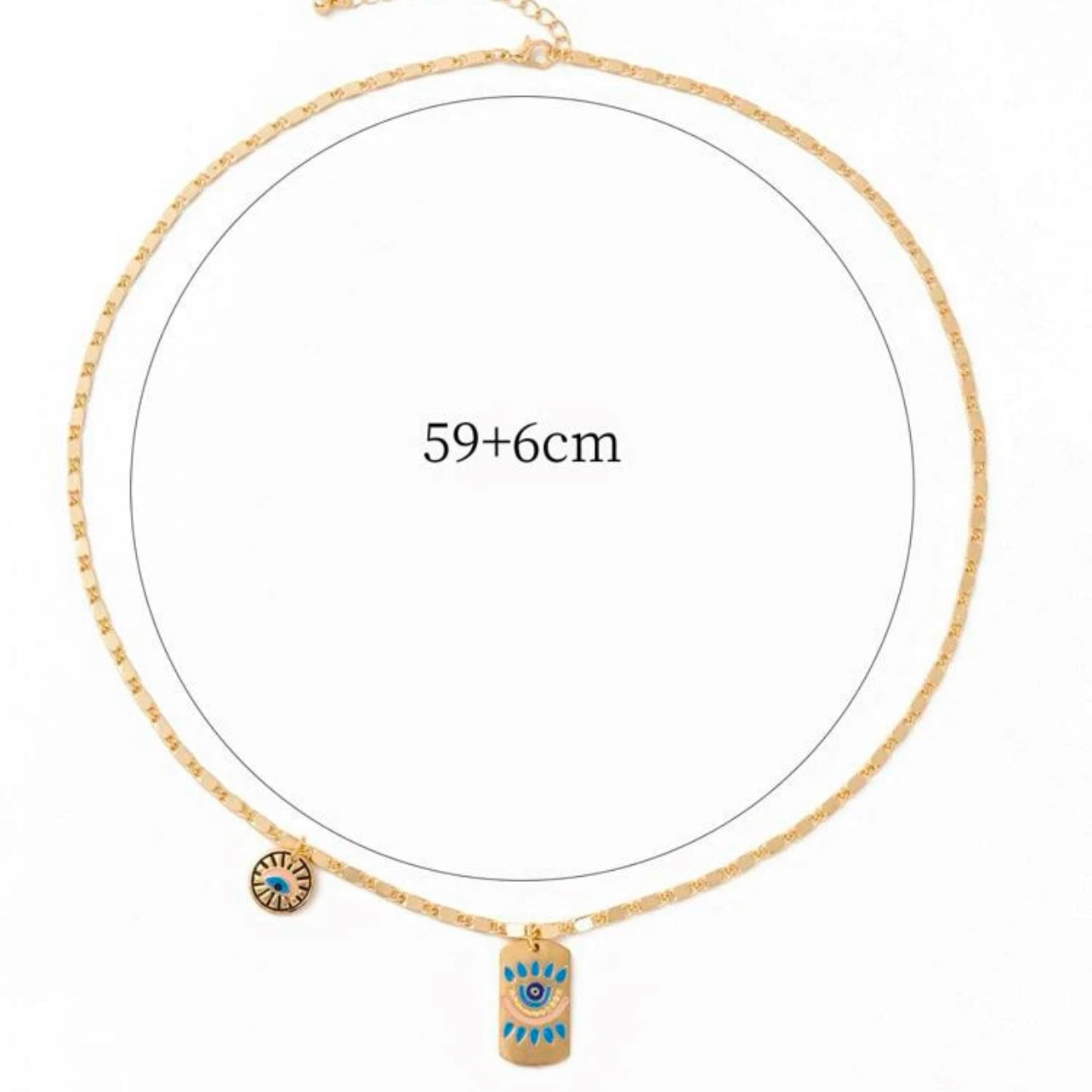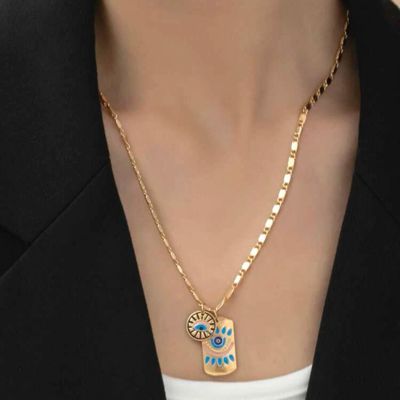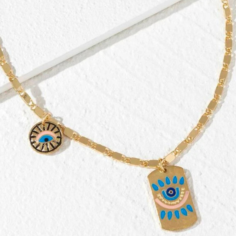 Experience elegance and protection with our Gold Plated Evil Eye & Protection Pendant Necklace. The stunning blue enamel accents on the 10k gold plated "Dog Tag" style pendant and the round Evil eye pendant add a touch of sophistication. With a durable 17In chain, this necklace is the perfect blend of style and protection. Crafted with intricate details, it is sure to bring you good fortune and good luck daily & a ton of compliments!