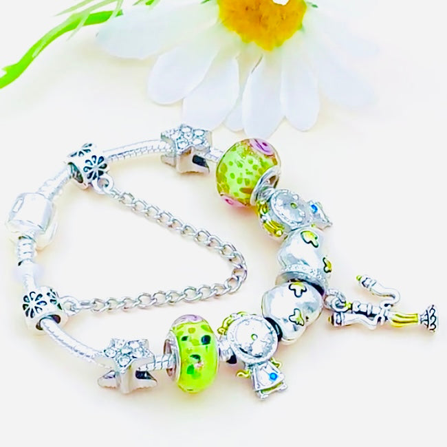 Charms: 9 Beautiful Charms in total - mostly Silver with some charms being yellow handcrafted glass beads (unbreakable)