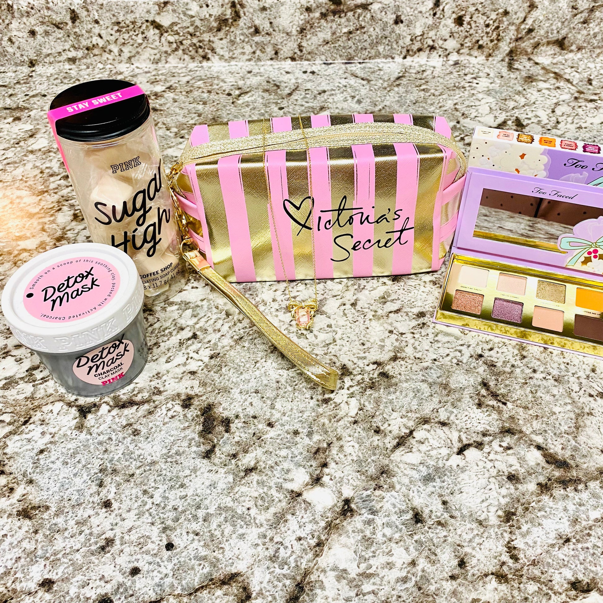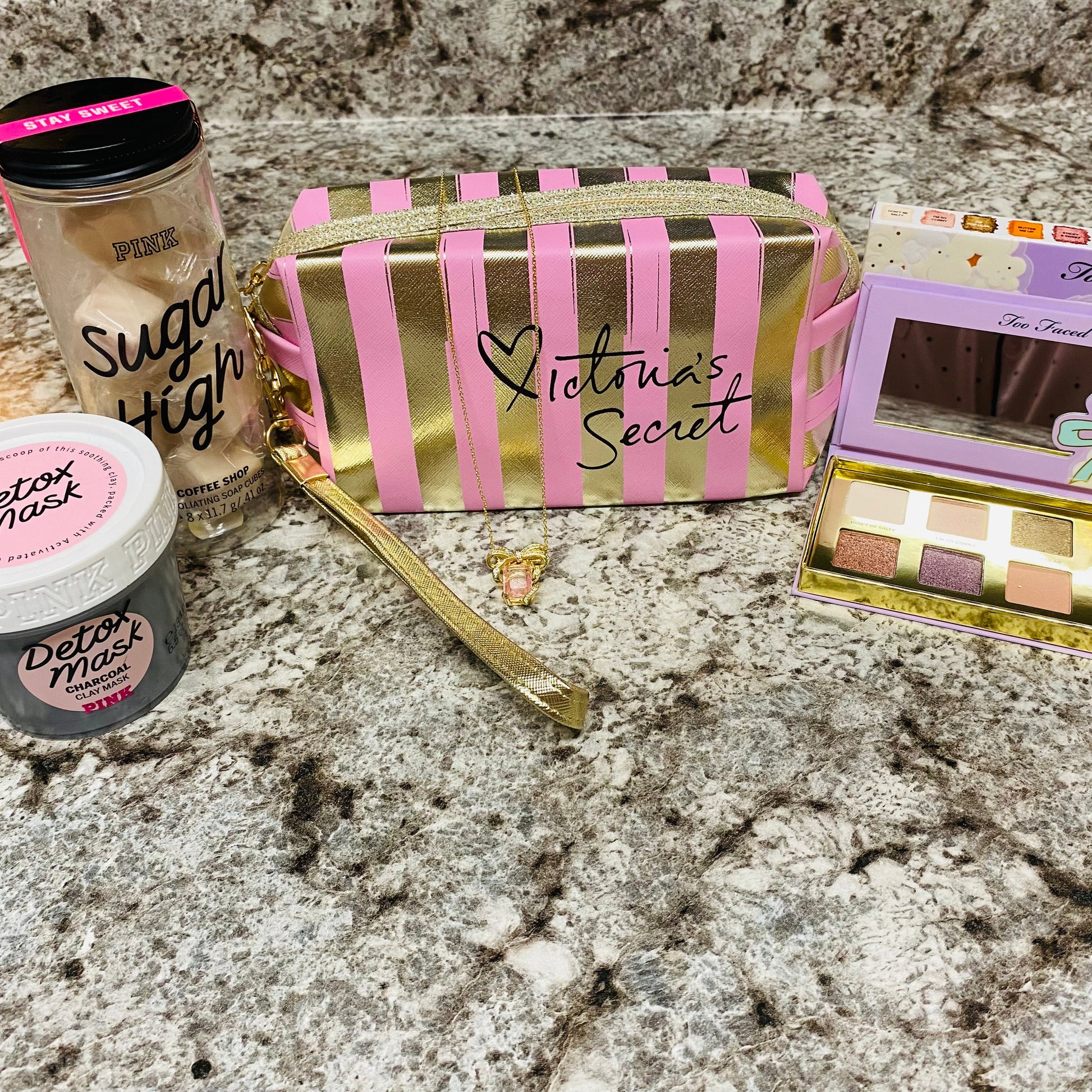 - Victoria’s Secret Pink Gold & Black Striped Cosmetic Bag: Newly released stylish pink and gold striped bag with the iconic Victoria’s Secret logo, perfect for storing all your beauty essentials & looking stylish while doing so.